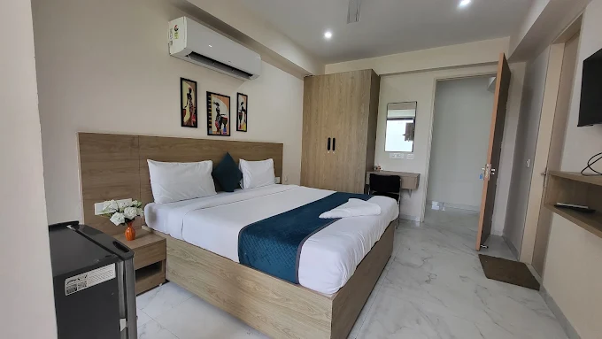 Furnished rooms with bed, wardrobe, study desk, AC, and Wi-Fi.